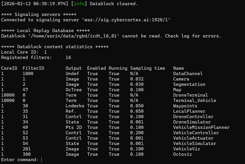 At the end of the DataBlock, the 'Enter command:' text shows that the user can enter a filter ID for inspecting its output. For example, entering '201' (tap Enter twice in windows) will show the output of the VehicleViz filter: