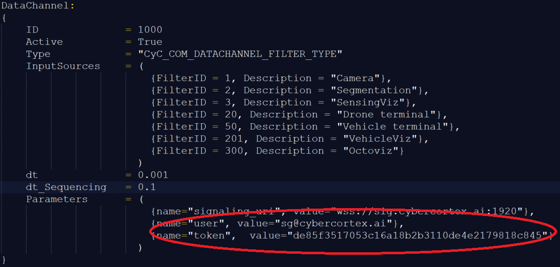 In the DataBlock configuration file 'etc/datablocks/example.conf', copy and paste your username and the generated token in the parameters of the DataChannel filter: