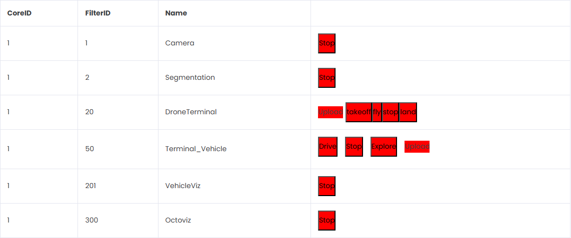 The output of each displayed filter can be visualized by clicking on it. Input commands can be given to the aerial drone and the ground vehicle via the 'Terminal' filters (press fly / drive).