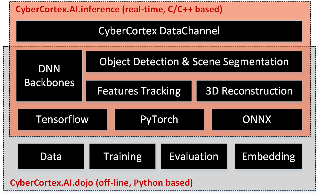 Our main product is the CyberCortex.AI framework, composed of the real-time CyberCortex.Inference control system and the CyberCortex.Dojo training platform. Together, these can be used to construct various real-time robotics applications based on custom tailored Artificial Intelligence components.